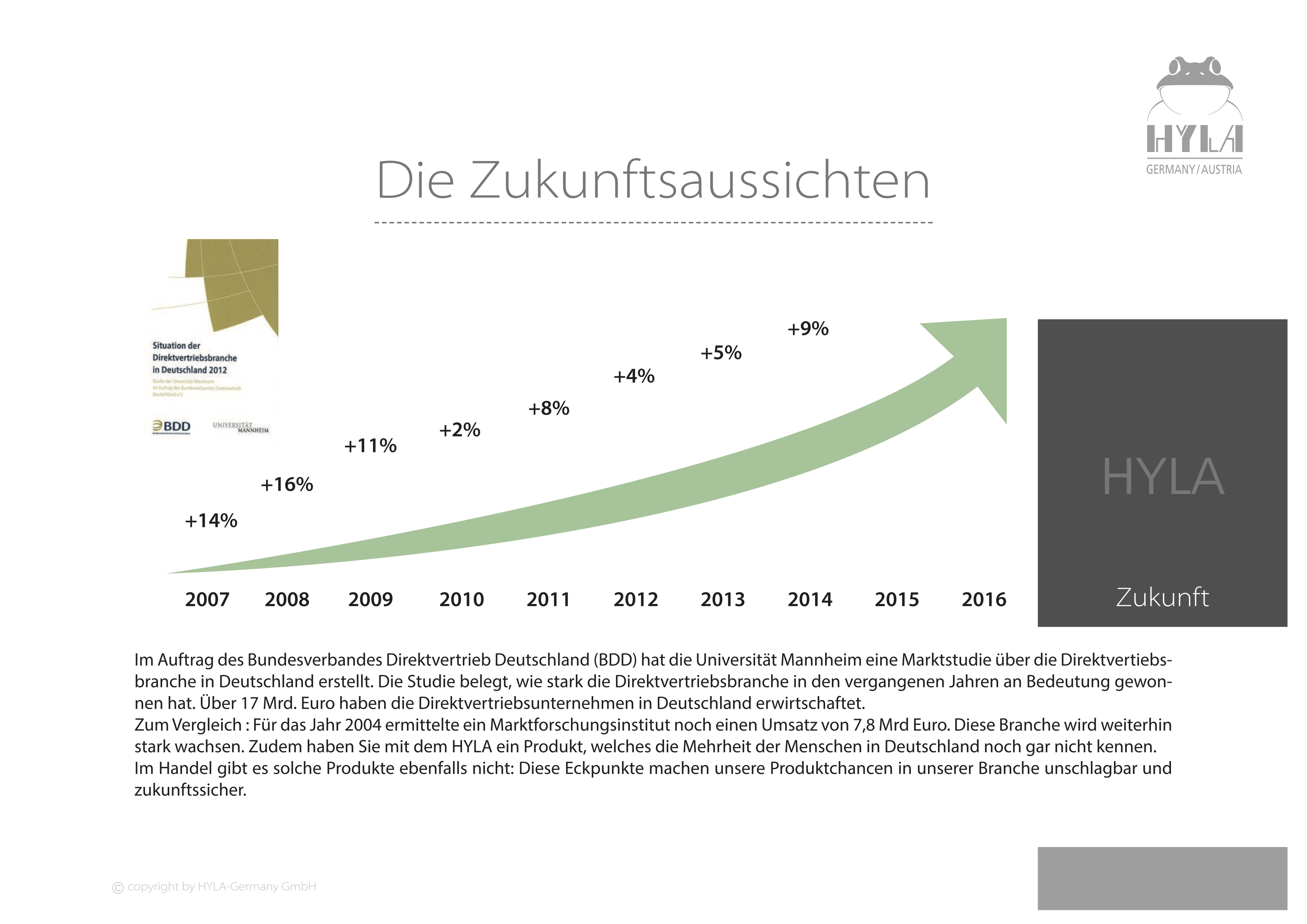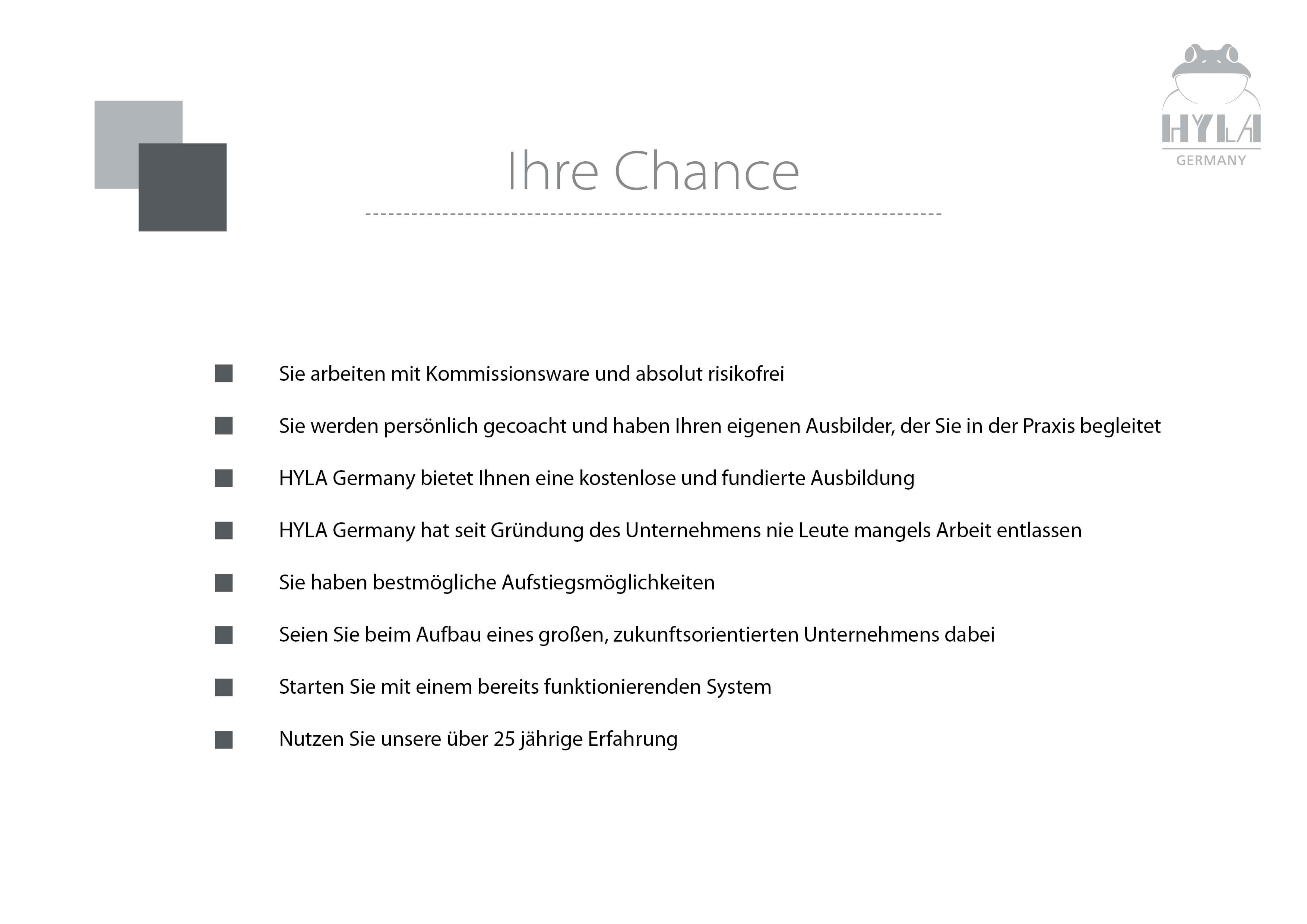 Bereits nach kurzer Einarbeitungszeit und kostenloser Ausbildung entscheiden Sie, ob Sie als Verkäufer oder als HYLA-Fachhändler in unser Team einsteigen wollen.